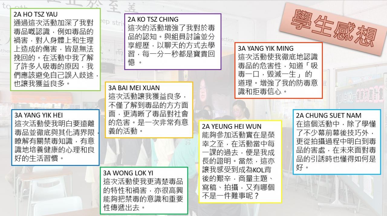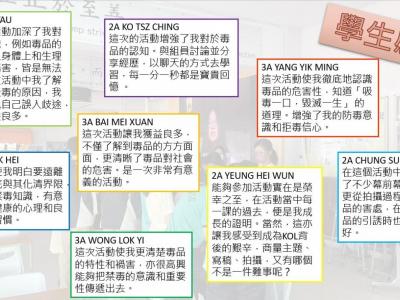 本校健康校園大使製作了一系列的禁毒短片及KAHOOT!問答遊戲,提升同學對毒品的認識,並於5月12日在教育局舉辦的分享會中,與其他學校分享參加活動之心得及成果。