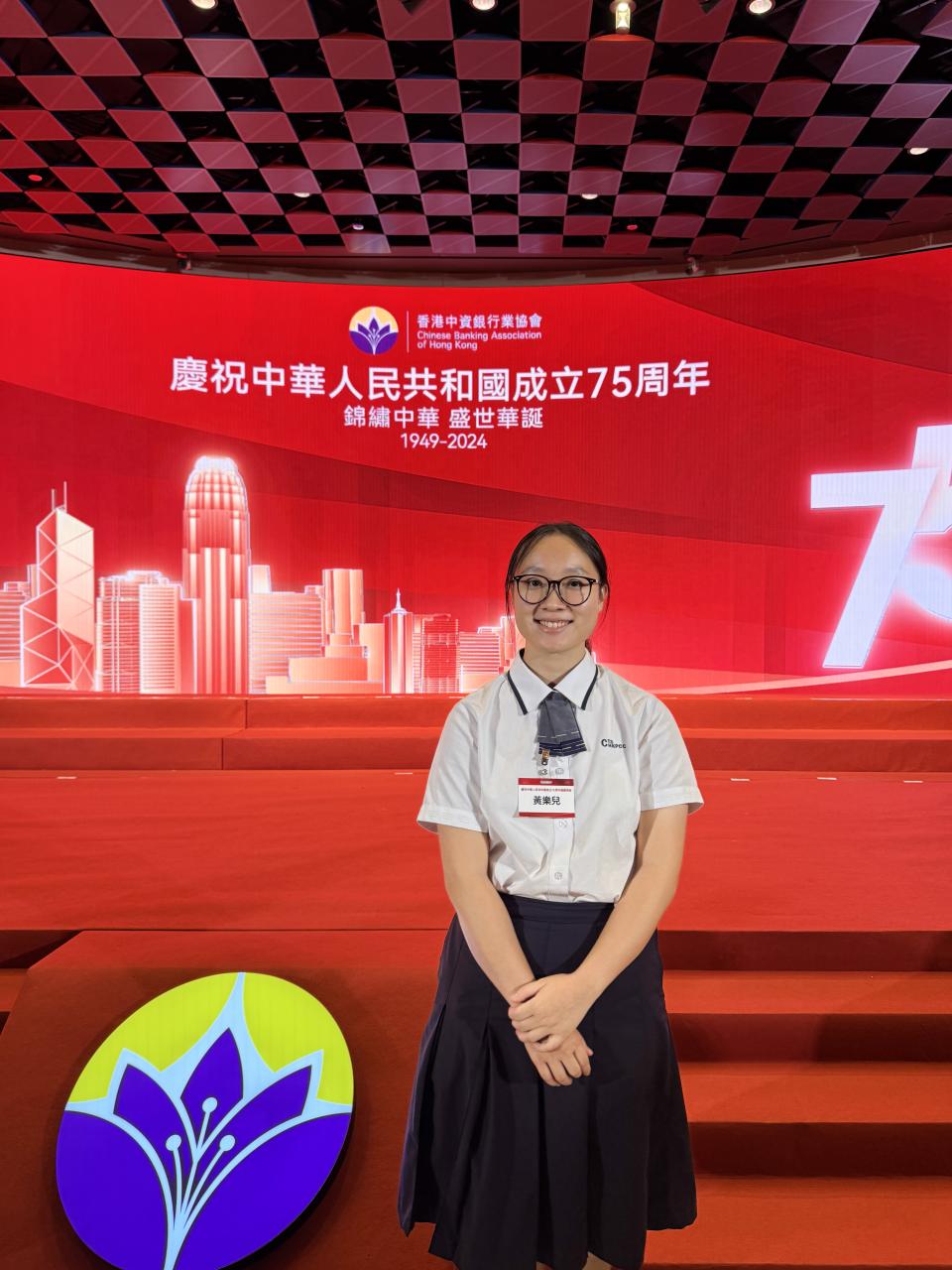 本校經濟科6A黃樂兒同學,於九月十六日到訪香港交易所香港金融大會堂,出席由香港中資銀行業協會主辦的慶祝中華人民共和國成立75周年酒會。