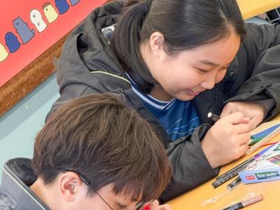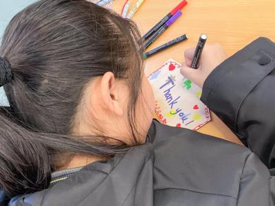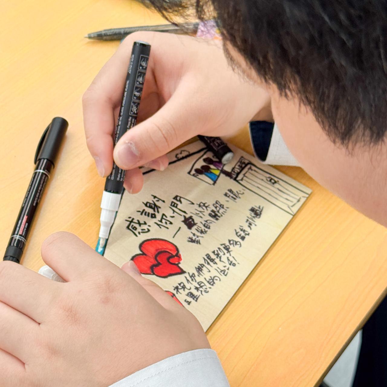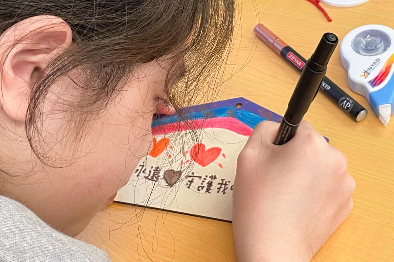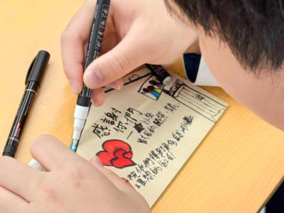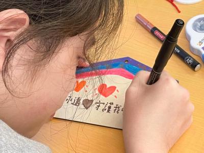 學生於活動中,認真繪畫,用心以文字表達對父母感恩之情。